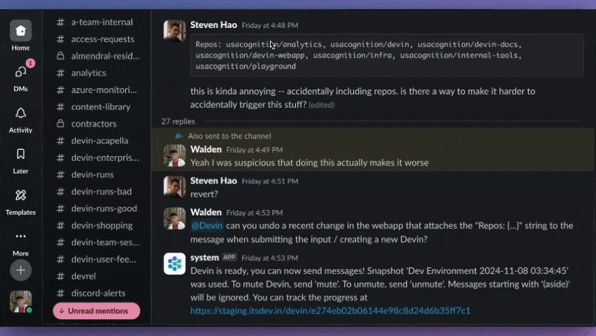 • Tagging Devin on a Slack thread about a bug you’re discussing with coworkers
