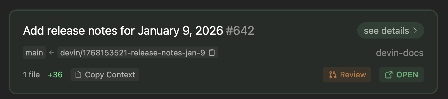 セッション UIセッションごとの主要な判断ポイントである Task、Plan、PR、Summary をより明確に強調し、インターフェースをスリムにするために Session UI を更新しました。Devin のセッション進行状況にはこれまで通りフルアクセスできますが、より分かりやすく直感的に表示されるようになっています。